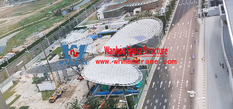 The steel structure of this project is a single-layer hyperbolic reticulated shell structure system with a symmetrical structure on the plane. The long span of the large wings is about 50m, the short span is about 25m, and the small wings are about 35m long and 15m in the short span direction. The top of the building is a hyperbolic shape, and the highest point of the building is about 17 meters above sea level. The total steel consumption is 800 tons, and the total membrane area is about 7,000 square meters.